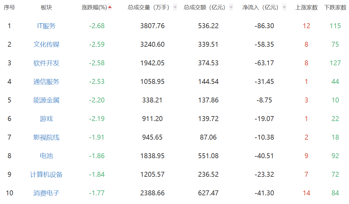 板块方面,煤炭开采加工、风电设备、中药等板块涨幅居前,IT服务、文化传媒、软件开发等板块跌幅居前。