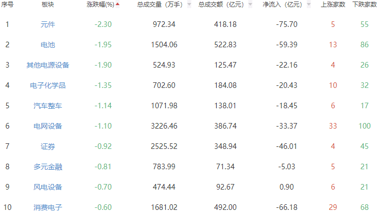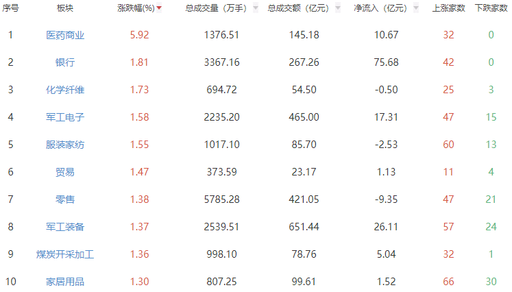行业板块方面,医药商业、银行、化学纤维等板块涨幅居前,元件、电池、电子化学品等板块跌幅居前。