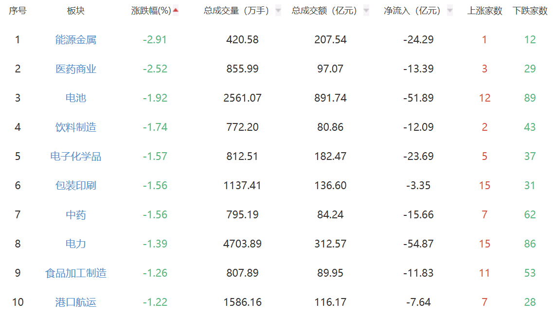 板块方面,化学纤维、多元金融、塑料制品等涨幅居前,能源金属、医药商业、电池等跌幅居前。