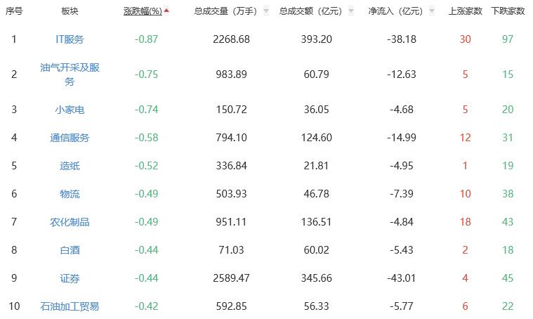 板块方面,电子化学品、金属新材料、小金属、煤炭开采加工等涨幅居前,IT服务、油气开采及服务、小家电、通信服务等跌幅居前。