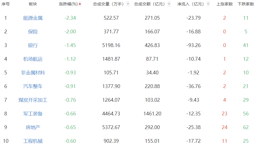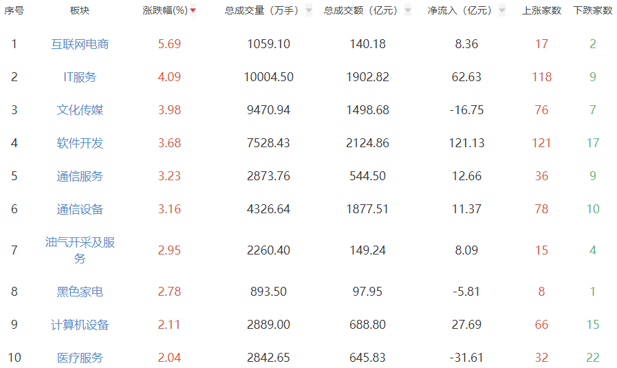 板块方面,互联网电商、IT服务、文化传媒等板块涨幅居前,能源金属、保险、银行等板块跌幅居前。