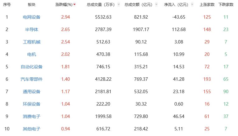 板块方面,电网设备、半导体、工程机械等涨幅居前,文化传媒、油气开采及服务、影视院线等跌幅居前。