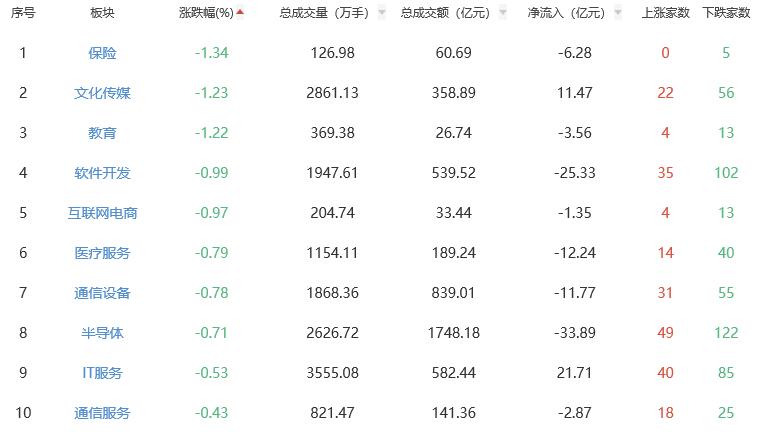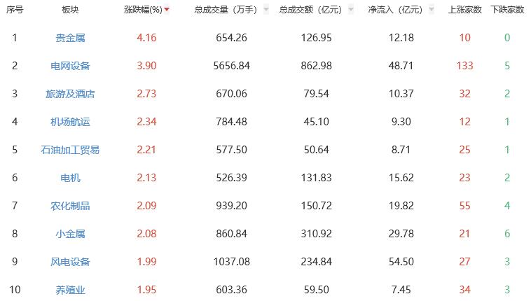 板块方面,贵金属、电网设备、旅游及酒店等涨幅居前,保险、文化传媒、教育等跌幅居前。