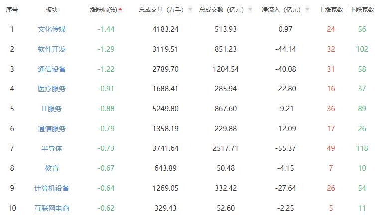 板块方面,贵金属、电网设备、旅游及酒店等涨幅居前,文化传媒、软件开发、通信设备等跌幅居前。
