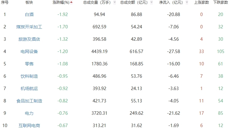 板块方面,贵金属、小金属、能源金属等板块涨幅居前,白酒、煤炭开采加工、旅游及酒店等板块跌幅居前。