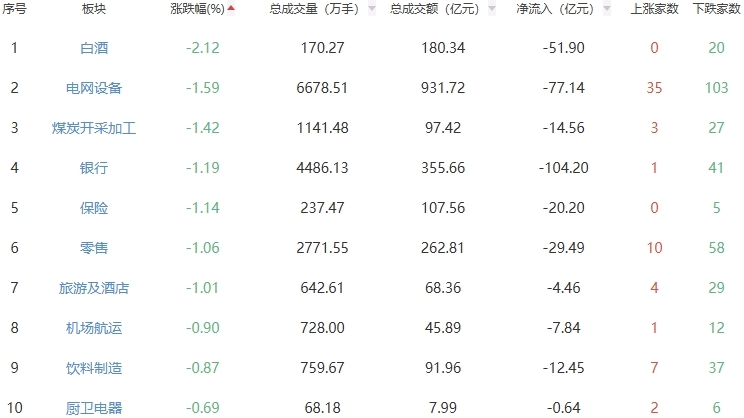 板块方面,贵金属、能源金属、小金属等板块涨幅居前,白酒、电网设备、煤炭开采加工等板块跌幅居前。
