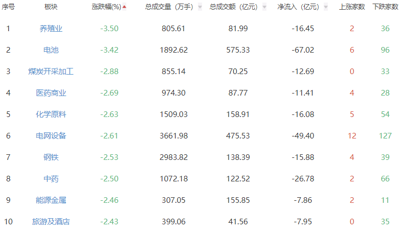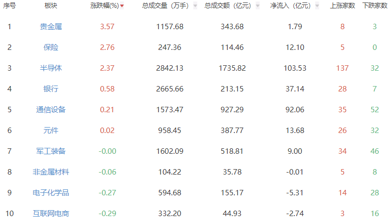 板块方面,贵金属、保险、半导体等板块涨幅居前,养殖业、电池、煤炭开采加工等板块跌幅居前。