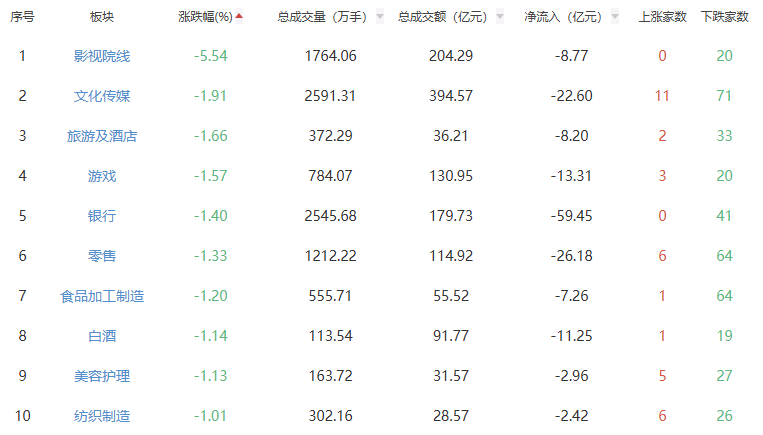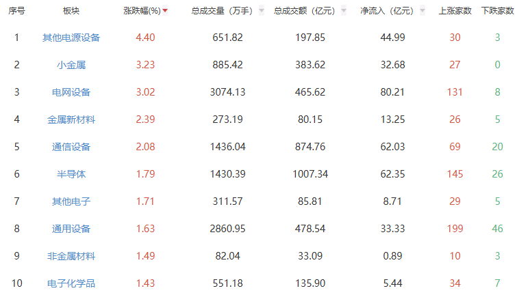 板块方面,其他电源设备、小金属、电网设备等板块涨幅居前,影视院线、文化传媒、旅游及酒店等板块跌幅居前。