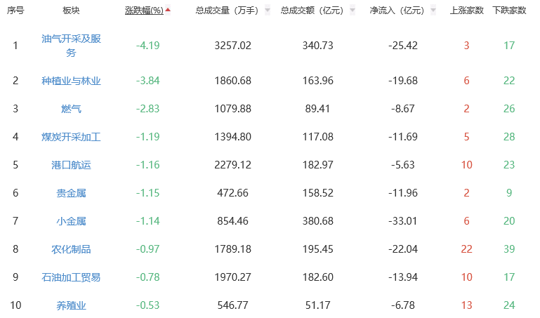 板块方面,光学光电子、电网设备、其他电源设备等板块涨幅居前,油气开采及服务、种植业与林业、燃气等板块跌幅居前。
