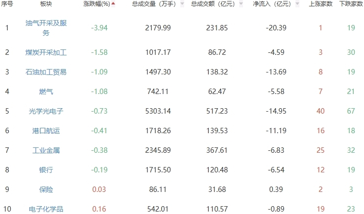 板块方面,其他电源设备、养殖业、农化制品等板块涨幅居前,油气开采及服务、煤炭开采加工、石油加工贸易等板块跌幅居前。