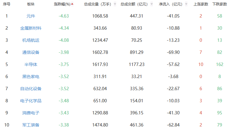 行业板块方面,油气开采及服务、煤炭开采加工、电网设备等板块涨幅居前,元件、金属新材料、机场航运等板块跌幅居前。
