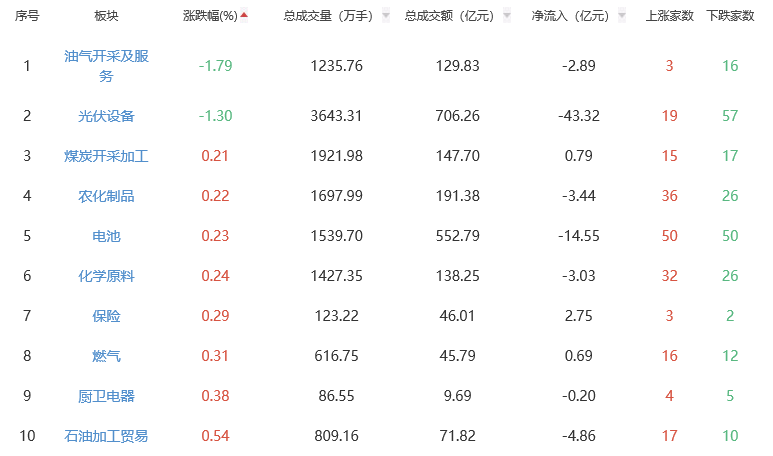 板块方面,电力、港口航运、环保设备等板块涨幅居前,油气开采及服务、光伏设备板块下跌。