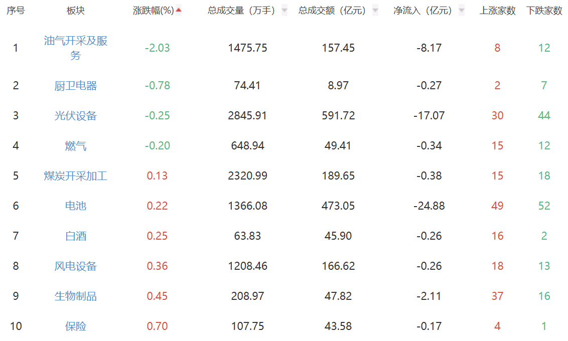 板块方面,电力、通信服务、贵金属板块涨幅居前,油气开采及服务、厨卫电器、光伏设备、燃气板块下跌。