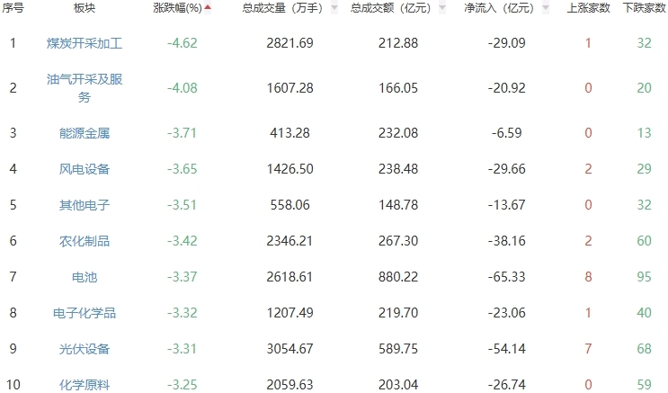板块方面,轨交设备、汽车服务及其他、汽车整车等板块涨幅居前,煤炭开采加工、油气开采及服务、能源金属等板块跌幅居前。