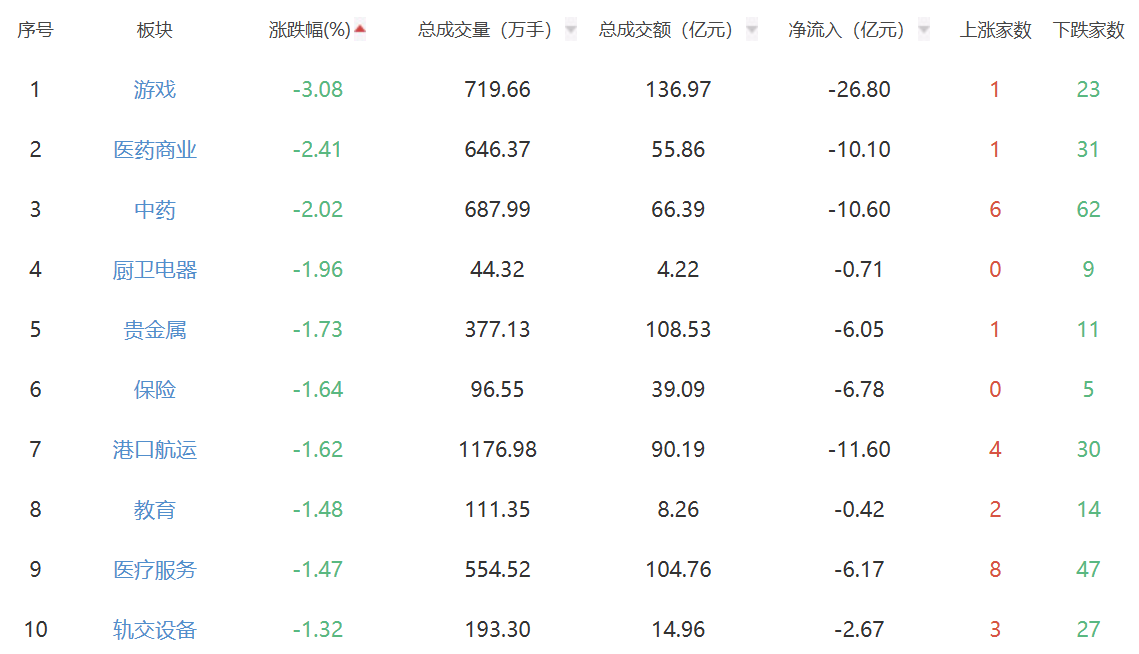 板块方面,能源金属、元件、光伏设备、养殖业等板块涨幅居前,游戏、医药商业、中药等板块跌幅居前。