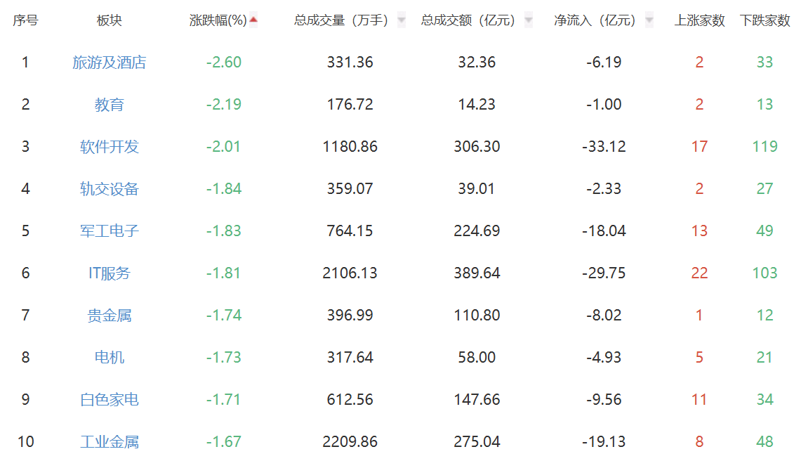 板块方面,煤炭开采加工、证券等涨幅居前,旅游及酒店、教育、软件开发等跌幅居前。