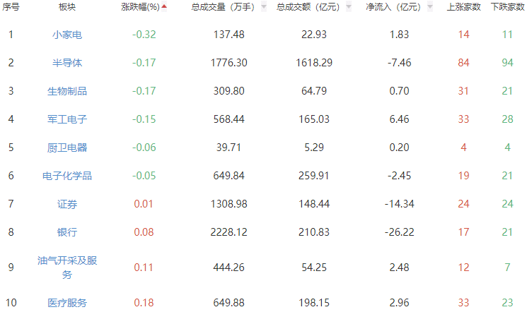 板块方面,小金属、能源金属、电池等涨幅居前,小家电、半导体、生物制品等跌幅居前。