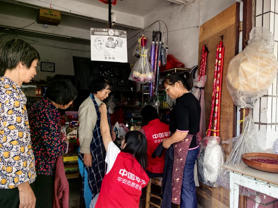 活动当天,村里一家小卖部里格外热闹。平安产险德化支公司的志愿者们早早地搭好了简易的“工位”,备齐了剪刀、针线、布料等工具。他们化身“暖心裁缝”,把村里小卖部变成了充满人情味的“定制工坊”。他们把穿久了裤脚磨损的裤子、或因年纪大不合身的裤子和被柴火勾出线头的围裙变成老人手中专属的“潮流单品”。