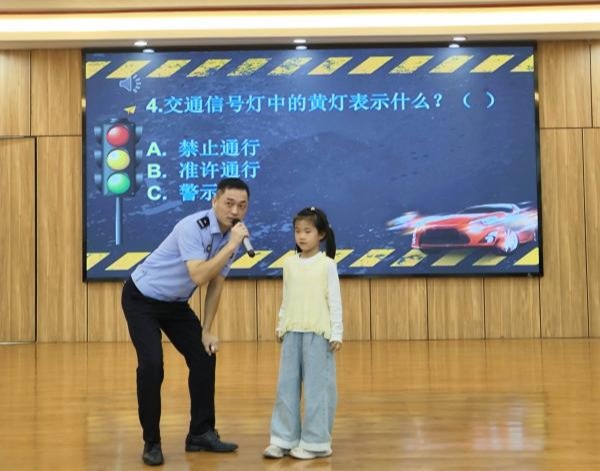 “同学们,你们知道交通信号灯中的黄灯表示什么吗?”交警叔叔话音刚落,一只只小手便争先恐后地举了起来。“是警示!”一位扎着马尾辫的小女孩自信地回答,脸上洋溢着收获知识的喜悦。在轻松有趣的互动问答中,孩子们不仅记住了交通信号的含义,更在心底种下了“遵守交规,人人有责”的种子。