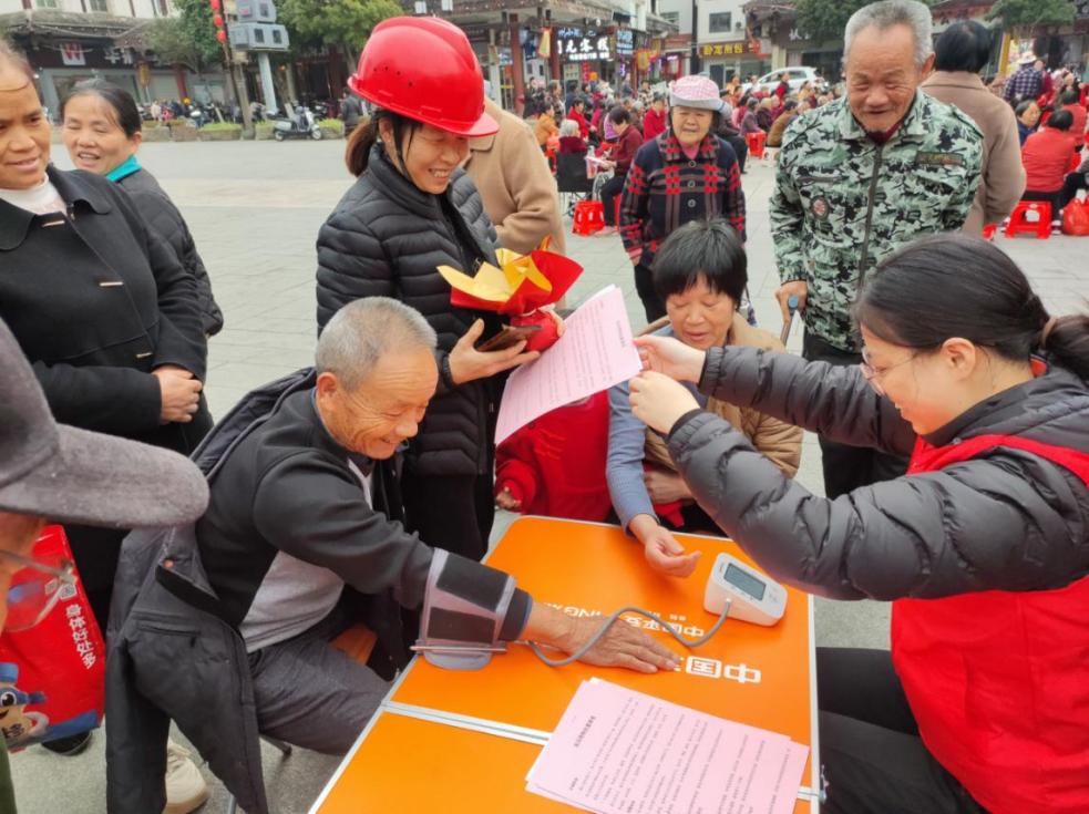 在长汀县三元阁广场上,量血压的居民排起长队。平安产险龙岩中心支公司长汀营销服务部的志愿者细致为老人们解读数据:“阿姨血压控制得不错,记得清淡饮食。”刚测完血压的阿姨乐呵呵地说:“这个活动真贴心,不仅免费测了血压,还收到平安健康的祝福,心里暖乎乎的!”