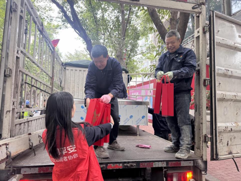 在福州长乐的晨曦中,环卫工李阿姨接过平安产险志愿者递来的平安果,红绸带映着她冻得发红的指尖微微发亮。“这包装真喜庆”,她腼腆的笑容里藏着对城市整洁的坚守。这天,平安产险志愿者还将春联送到福州的户外工作者手中。建筑工人两鬓染霜却笑意达观:“年未到,福先到,平安心意到,好运马上到!”