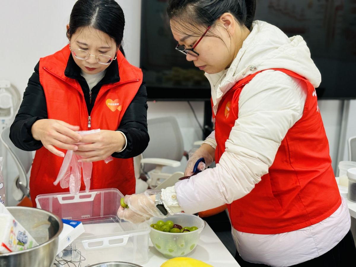 活动现场,暖光氤氲,甜香四溢。平安志愿者们早早备齐新鲜奶油、饱满鲜果与绵软蛋糕胚,专业烘焙老师细致讲解制作技巧,志愿者们则俯身协助小朋友摆水果、做裱花。孩子们的小脸上满是专注与喜悦,稚嫩的小手认真雕琢着蛋糕,从奶油抹面到鲜果装饰,每一个步骤都藏着对老人的美好期许。经过一个多小时的创作,一个个造型可爱、香气四溢的蛋糕新鲜出炉,每一份都承载着亲子协作的默契,更包裹着童真的善意。