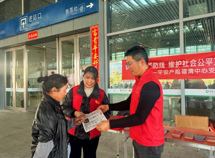 “辛苦挣来的钱,每一分都该稳稳地落在兜里。”在福清动车站内,平安产险福清中心支公司志愿者们深知,守护好旅客的财产安全,便是此刻最实在的关怀。他们在进站口、服务站开设“平安小课堂”,手持宣传折页,耐心细致地向等候的旅客,特别是中老年群体,讲解近期高发的电信网络诈骗案例和防范技巧。