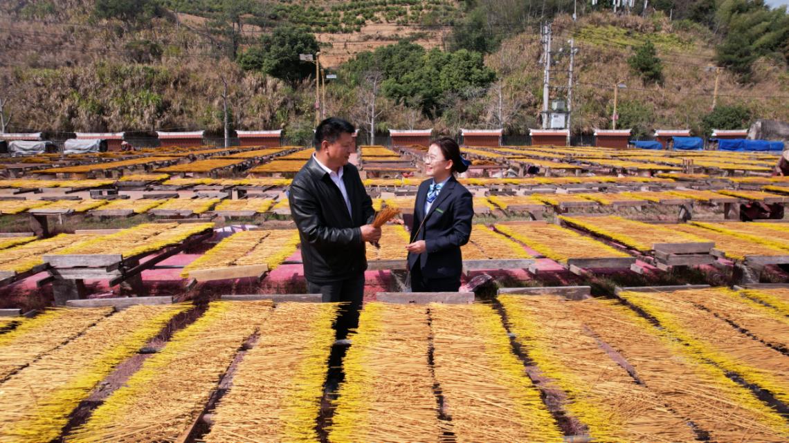 “感谢感谢!张经理来得正好,正赶上我们‘醒料’。”叶华东接过吉祥物,引她往里走。墙角,堆积如山的檀木原料,是年前刚用贷款备下的货。“闽南的春节要过到正月十五,现在篾香的需求还很旺。多亏年前的贷款及时到位,有了这些货,我心里的石头才算落了地。”